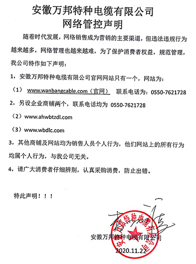 鄭重聲明:安徽萬邦特種電纜有限公司官方網站為:www_wanbangcable_com.igmulur.cn,除此之外無任何子網站或合作網站,其余均為假冒偽劣。電話:0550-7621728 13485756353 地 址:安徽省天長市滁州高新技術產業開發區經四路29號
